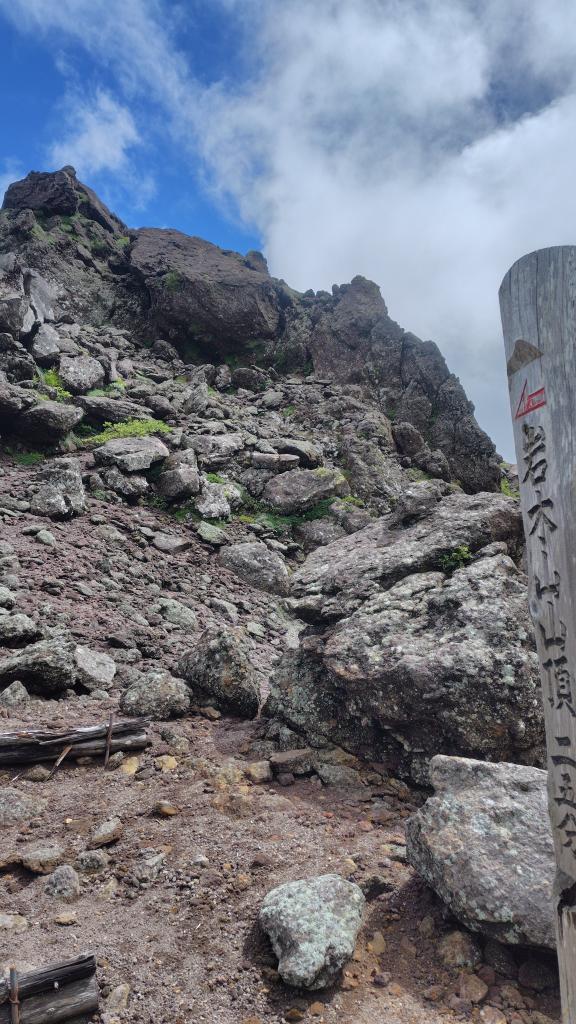 岩木山山頂への岩場はかなり急で大変だった。右登りという看板があちこちに立っていてとにかく右寄りを意識しながら登っていった。