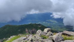 10:30、鳥海山到着。山頂には大きな岩があって割れ目に小銭が詰め込まれていた。ここからはリフト乗り場と岩木山が見えて、急な岩場を多くの人が登り降りしていた。高山はこういうふうに眺望が開けているのが楽しい。