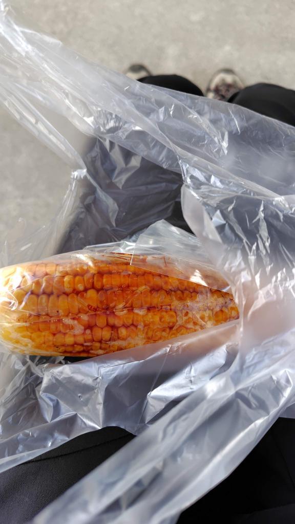 下山、12:30に8合目着、14:00ごろに麓の登山口に到着。バス停前の露店も開いていて焼きとうもろこしを食べてみる。何年ぶりだろうか。